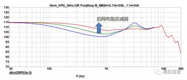 改变后网布阻尼对频响曲线的影响 (按照箭头方向,网布阻尼逐渐减弱)