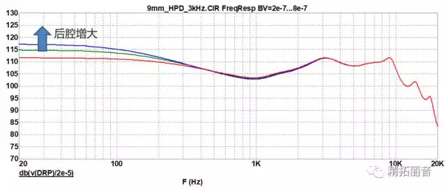 改变后腔大小对频响曲线的影响 (按照箭头方向,后腔逐渐增大)
